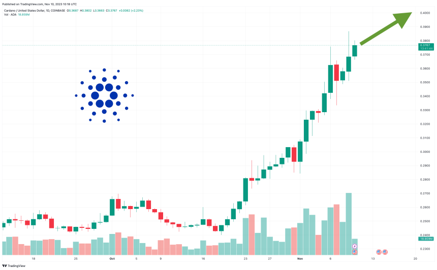 Yet as ADA’s support level (green) already appears to show, the coin seems to be have begun a breakout, having risen form under $0.25 as recently as the middle of October to nearly $0.38 today.